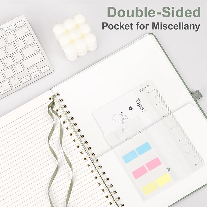 - PRACTICAL LAYOUT: Equipped an elastic band, a pen holder and removable bookmark ruler to keep your notebook organized. Comes with a DIY bookmark with a ribbon for self-attachment to the spiral, serving as a bookmark. Features a double-sided pocket for storing miscellany and 18pcs sticky notes for additional organization and reminders