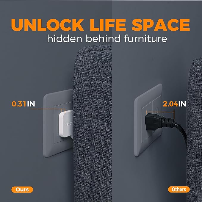- Ultra Thin Flat Plug Power Strip: Featuring an ultra thin 0.3in flat head design, this flat plug extension cord can easily fit into tight spaces and hide discreetly behind sofa, bed, nightstand, or other furniture. The 45 degree right angle design creates additional space for other plugs below without blocking.