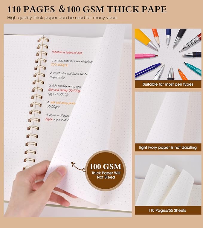 - 【100 GSM Ink-friendly Paper】 Our yellow spiral dot grid notebook pages are very thick, which avoids ink bleeding through and ghosting. Suitable for most pen types, such as ballpoint pens, fountain pens. Each dotted journal 55 sheets/110 pages, offering enough space to write in. Allowing you to write on both sides of every page to maximize your usable space. light ivory paper is not dazzling, let you have a comfortable writing experience.