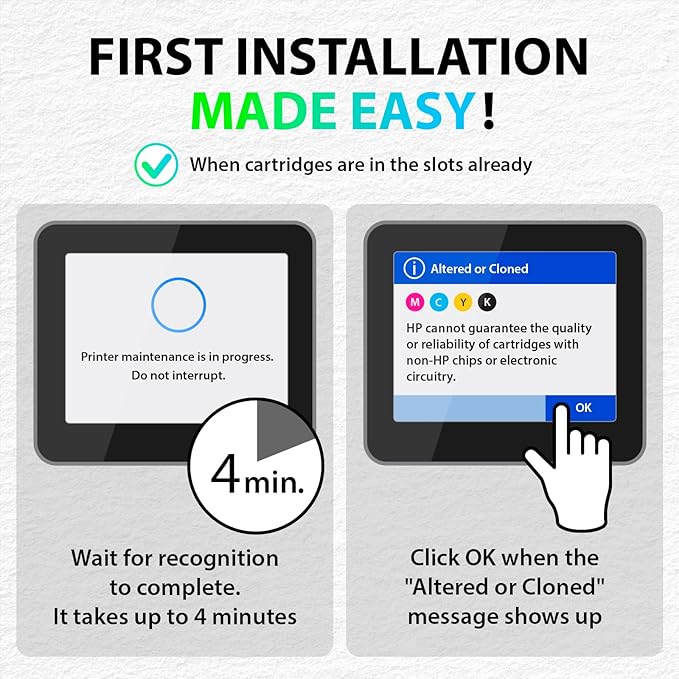 - Important: Expect a 4-minute recognition period during the first install of this replacement for HP 910XL printer ink cartridges. When the "Altered or Cloned" message appears, click OK to proceed printing on your HP 8015e printer or other models listed above
