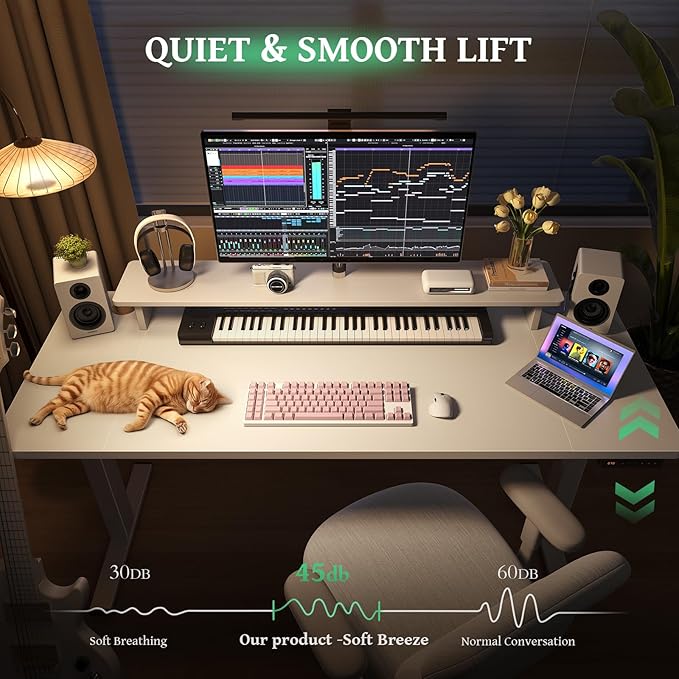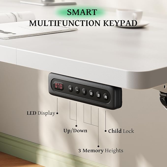 - Customized Sit Stand Desk : The reliable motor operates quietly (under 45 dB)and smoothly, all your things stay steady&secure in motion. The intuitive control panel allows you to preset 3 preferred heights, switch between sitting and standing positions has never been easier. Child lock for total peace of mind.