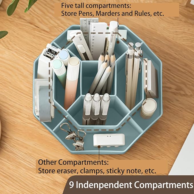 Pencil Pen Holder for Desk, 9 Slots 360 Degree Rotating Desk Organizer, Cute Pen Organizers Stationery Supplies for Office Home & Art Supply (Blue)