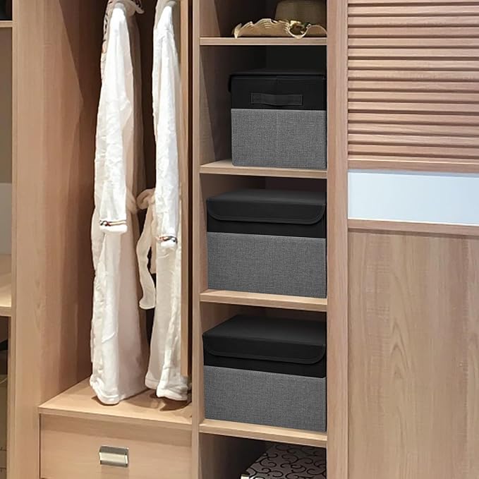 Large 17" 42 Quarts Collapsible Stackable Storage Bins with Lids [3-Pack] Foldable Fabric Linen Storage Boxes Cube, Closet Organizer Baskets with Label for Home (16.7 x 12 x 12", Black & Gray)