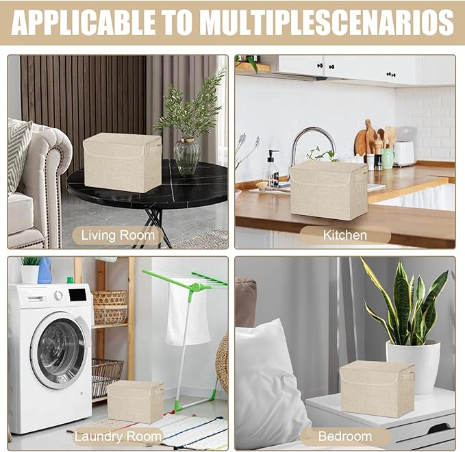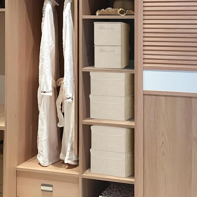 Small 8 Quart Linen Fabric Foldable Storage Bin Cube Organizer Basket with Lid & Handles, Collapsible Decorative Box Container for Home, Dorm, Closet, Beige, 10"x8"x6", 6-Pack