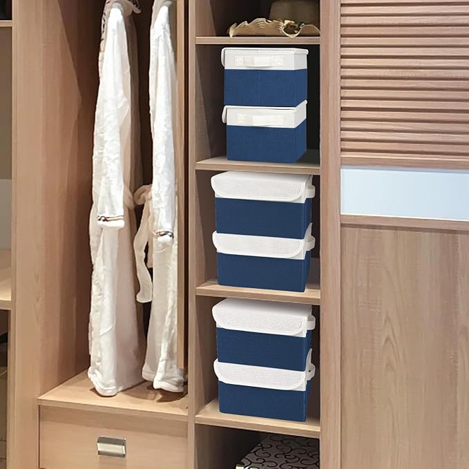 Small 8 Quart Linen Fabric Foldable Storage Bin Cube Organizer Basket with Lid & Handles, Collapsible Decorative Box Container for Home, Dorm, Closet (Navy Blue & White, 10"x8"x6", 6-Pack)