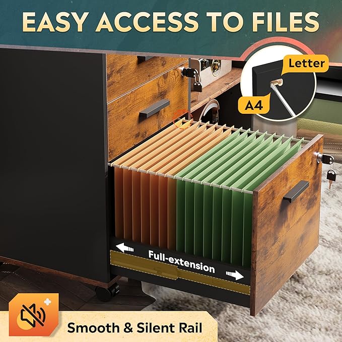 - Easy Mobility: The wooden file cabinet is equipped with 5 rolling wheels, allowing it to be easily moved and positioned beside or under desk. The front 2 wheels have built-in brakes and the bottom center is equipped with anti-tip casters to keep the cabinet stable.