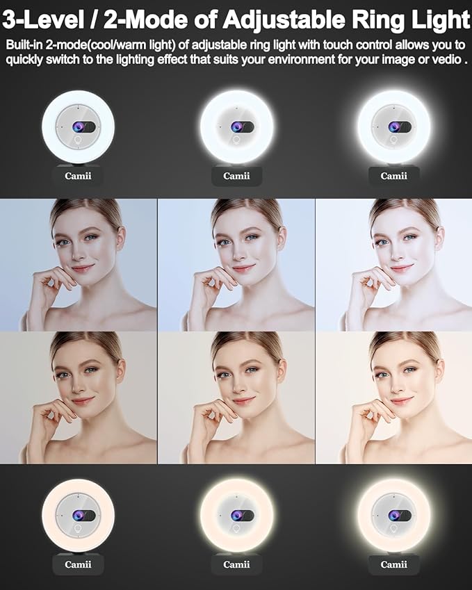 - [3-Level/2-Mode Adjustable Ring Light]: This 2K webcam with light has a built-in light ring that provides 3 different levels of light selection by touch control: low, medium and high. It can provide brighter and softer light without glare. It provides more light compensation even in dimly lit environments.