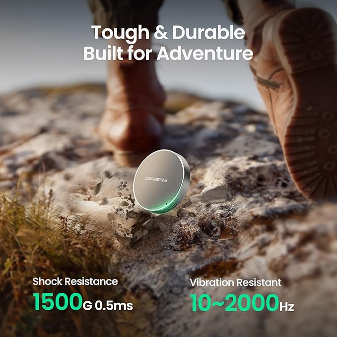 - Compact & Durable Design: The DIGIERA SSD is built with a rugged aluminum casing, making it resistant to shocks (1500G), vibrations (10-2000Hz), and drops (up to 3.94 feet). Weighing just 1.58 oz and measuring 2.28 x 0.46 inches (diameter x height), this portable SSD easily fits into your pocket or bag, making it an ideal companion for professionals on the move