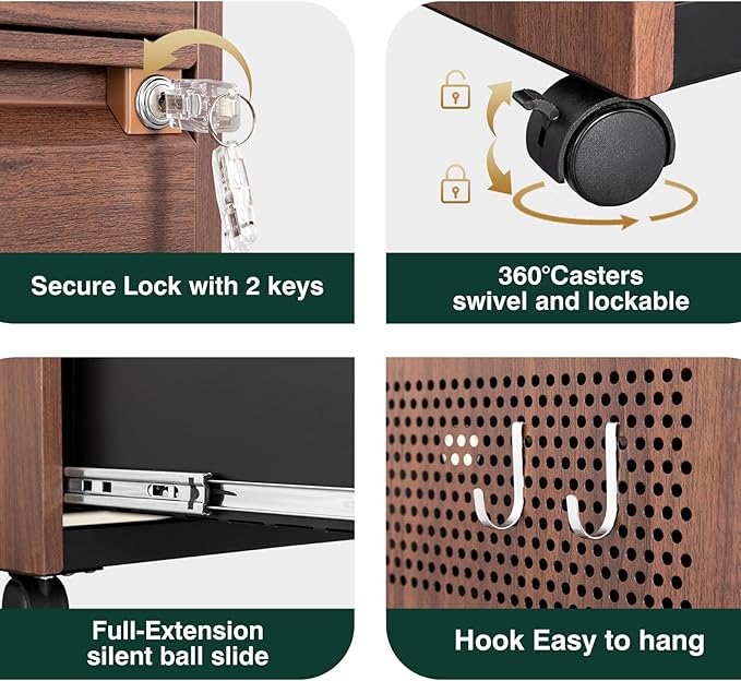 - 【Easy to Move and Assemble 】Cabinet is equiped with four rolling wheels. The left side two casters is lockable casters to keep the product in place and stable. The mobile file cabinet can fix or move around your home office freely. The lateral file cabinet can be assembled quickly and easily by one person and features a convenient and uncomplicated installation procedure with all properly labeled components and installation instruction video and manual.
