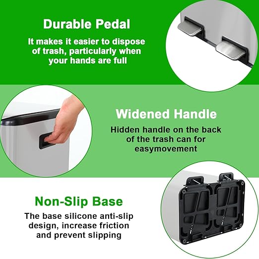 - Labor-saving Operation & Quiet Soft Close: The trash can has two separate ergonomic pedals that gently open the corresponding lid and are also easy for children to use. What's more, when the foot pedal frees the hands, the plastic cover not only effectively inhibits the odor in the bucket, but also has a noiseless buffer device for slowing down, which will not affect the quiet environment.