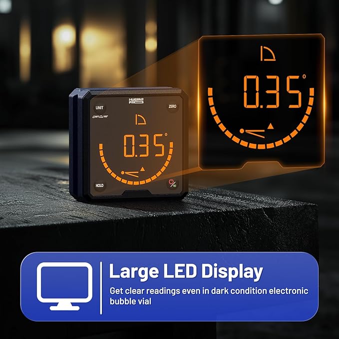 - 【Backlit LED Display & Built-in Electronic Level】The Digital Angle Gauge features a large backlit LED display, making it easy to read and quickly find the desired angle, even in low-light conditions. The backlight helps see the measurements clearly at all times. A built-in electronic bubble vial is included on the display, providing a reliable indication when you're leveling surfaces or performing other leveling tasks. This makes it an ideal tool for precision work, both indoors and outdoors