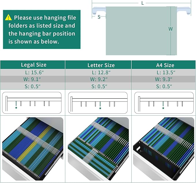 - Large storage drawer: Two drawer file cabinet provide large storage space, each drawer provides movable hanging bar, can allow letter size documents to be hung horizontally and vertically, legal and A4 size documents can only be hung vertically, not horizontally; Please carefully measure the size of your desk and documents before purchasing, so that you can better store and organize your documents.