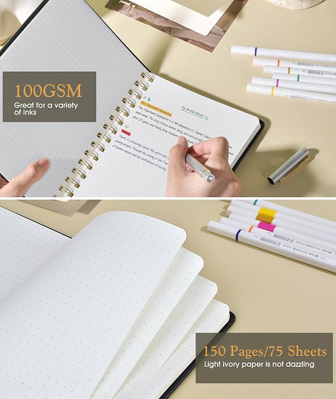 - 【A5 Journal with 100 GSM High-Quality Paper】 Crafted from 100 GSM thick ink-friendly paper, our notebook prevents ink bleed-through and ghosting. It accommodates various pens, including ballpoint, gel, and fountain pens. A5 size 5.75" x 8.38", perfect size for carrying around or put into your bag or purse.