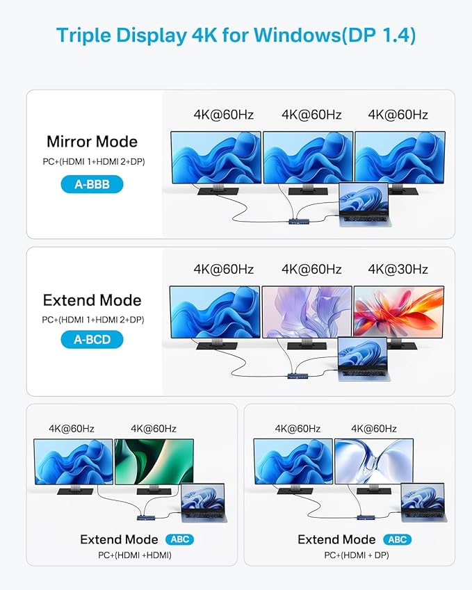 - Laptop Docking Station Triple Display: This usb c to DP/HDMI adapter supports single 4K@60Hz display and triple 4K@30Hz displays(under DP1.4). ONLY Windows system support MST and SST(Mirror & Extend Mode). MacOS system DOES NOT support MST