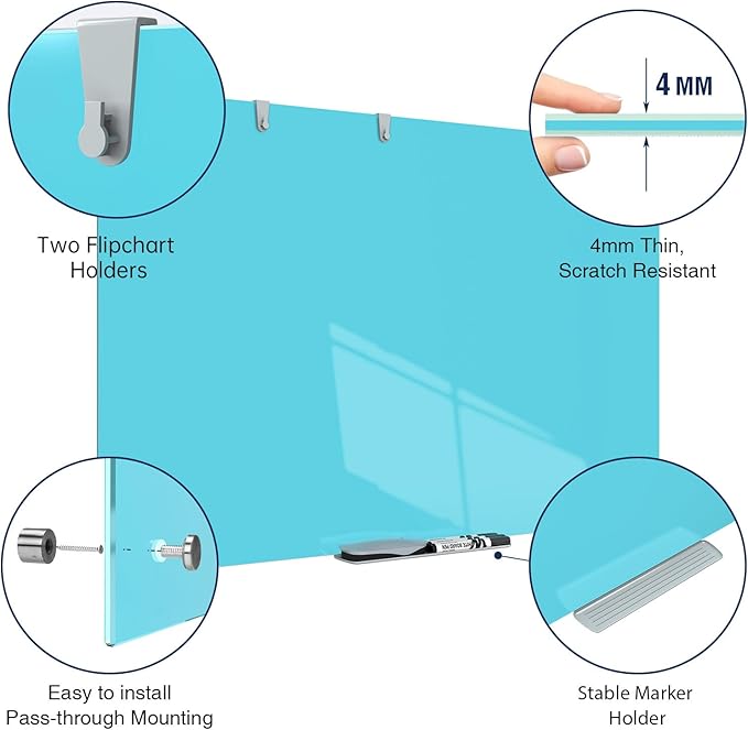 - PREMIUM GLASS WHITEBOARD - 36 x 24 inches glass whiteboard comes with smooth, strong and durable tempered glass surface, which is resists scratches and dents. This premium glass allows you to write, erase and rewrite on a clean surface every time.