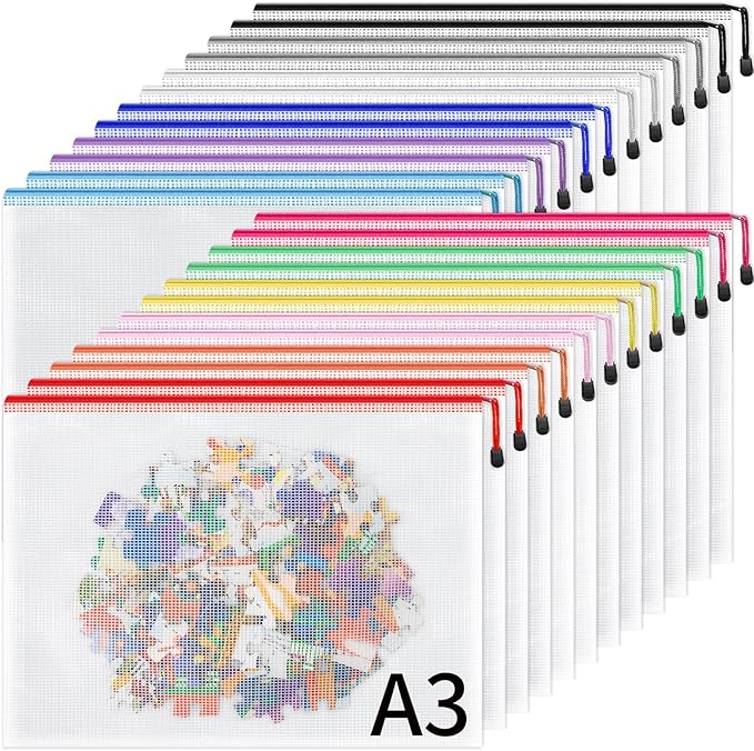 Umriox 24 Pack 12 Colors Zipper Pouches for Organizing, A3 Size (16.9 x 12.4), Big mesh Bags,Zipper Bags for Puzzles & Board Game Storage, Office Supplies Travel Toiletries