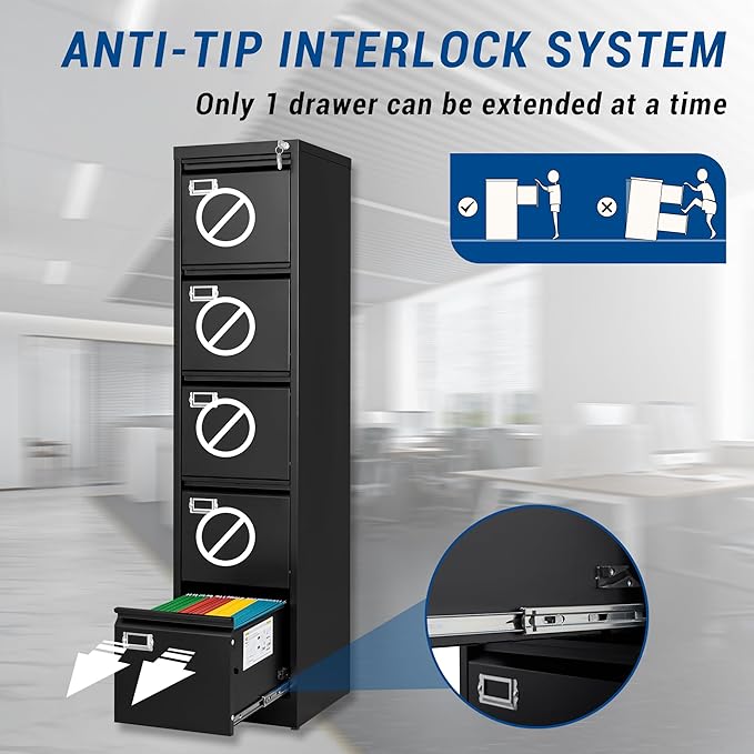 - LOCKABLE 5 DRAWERS FILE CABINET - All the file drawers can be locked by one lock, It is very convenient to control the whole filing cabinet with one key.