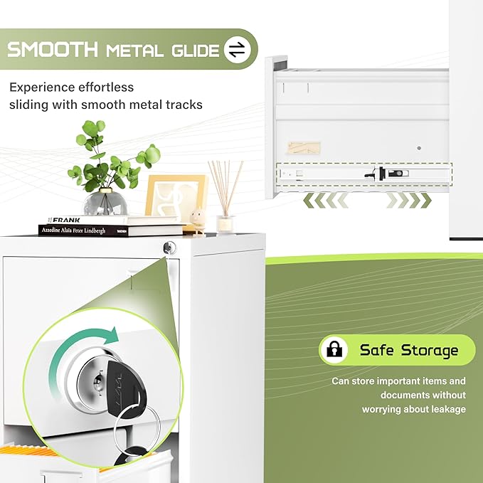 - 【High security】Two-drawer file cabinet with Lock is equipped with a built-in interlocking system to ensure drawer security. One locks with two keys ensures that your files are safe and easy to manage. The cabinet with drawers can be locked into two drawers at the same time with a lock, which is smooth and easy to operate.