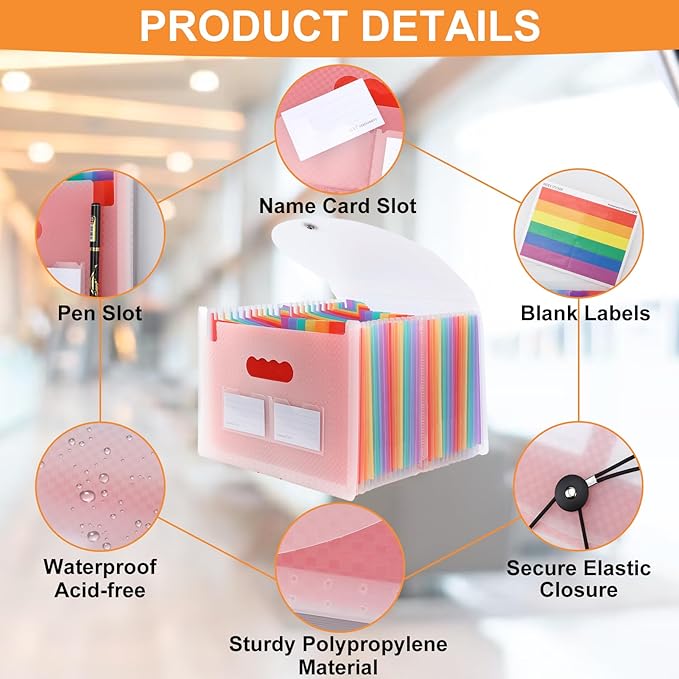 - Design Details: Two business card pockets are designed to easily store many small cards, such as courses, schedules, business cards. Accordion file Organizer comes with small colored labels to help you sort your files. The rope of the bayonet is of two sections and is used according to the thickness of the file