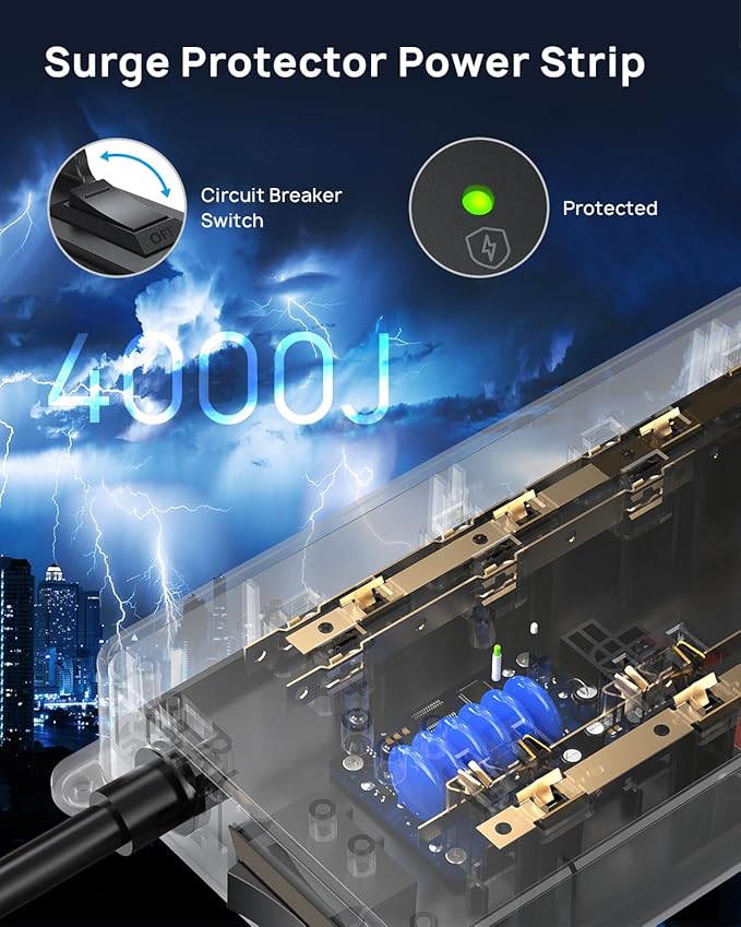 - 4000 Joules Surge Protection: This ETL-listed surge protector is made from high-quality UL94 V-0 flame-retardant material. With a high surge protection rating, it helps safeguard your electronics from power spikes, surges, and lightning strikes