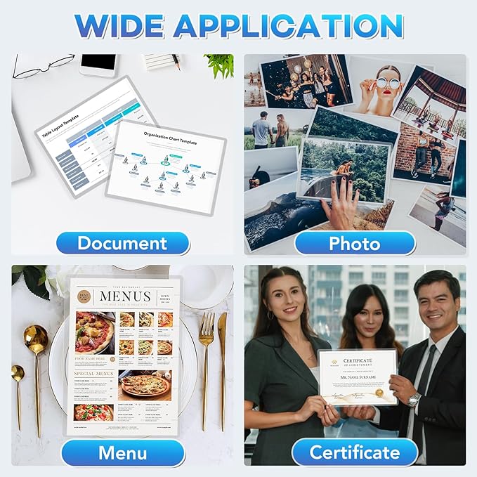 - Wide Application: This thermal laminating pouches is suitable for various scenarios and can be used to save files, photos, menus, recipe cards, certificates, etc. It can be used in classrooms, homes, and offices.
