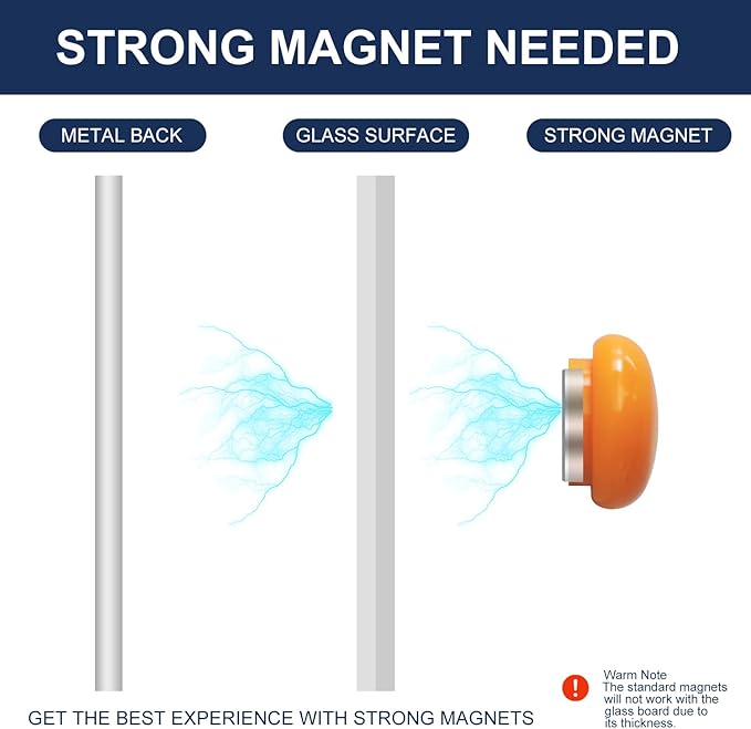 - MAGNETIC GLASS WHITEBOARD - Our glass white board comes with a multifunctional steel-backed magnetic glass and 4 high-power glass board magnets. Making this glass whiteboard perfect for meetings and presentations. (NOTE: The magnetism will not be strong due to the thickness of the glass, standard magnets do not work. The eraser is not magnetic.)