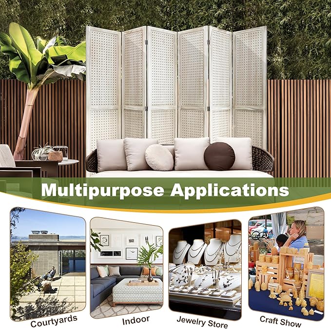 - Versatile Pegboard Panel Design: Our pegboard panel features 0.3-inch diameter holes spaced 1 inch apart, compatible with various peg hooks. This room divider doubles as a decorative folding privacy screen or wall organizer and is a freestanding display panel for trade shows, craft fairs, department stores, and more.