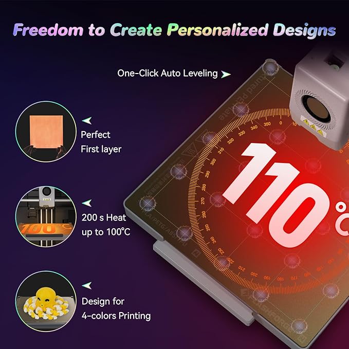 - Multi-Filament Print:Equipped with 300°C High Temp nozzle andd 32mm³/s large flow hotend will greatly shorten the waiting time for printing.Easily achieve multi-colorprinting for flexible TPU,carbon fiber filament,PLA and PETG,etc