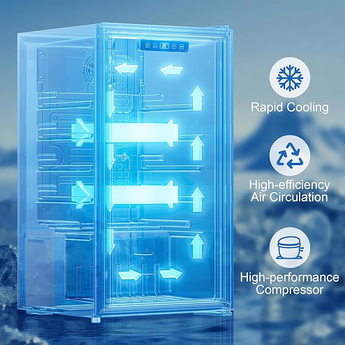- 𝗦𝗺𝗮𝗿𝘁 𝗧𝗲𝗺𝗽𝗲𝗿𝗮𝘁𝘂𝗿𝗲 𝗖𝗼𝗻𝘁𝗿𝗼𝗹:This smart beverage refrigerator features an intuitive Touch Temperature Control system with a clear Digital Display, allowing you to easily customize the temperature to suit your needs. Whether you're chilling sodas, beers, or aging fine wines, you can maintain an ideal temperature range from 35°F to 65°F. The efficient compressor cooling system provides quick cooling with minimal noise, ensuring a smooth and enjoyable drinking experience.