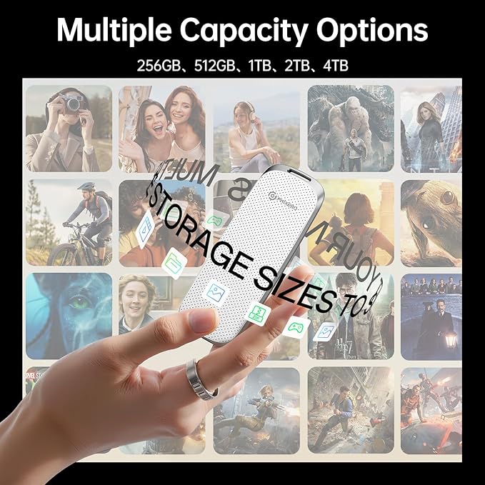 - BUILT TO LAST, LIGHTWEIGHT: Designed with durable Zinc alloy & plastic shell, the external hard drive 1TB is shock resistant, drop resistant and dustproof, providing superior protection for your critical data. Whether you're commuting, on a business trip, traveling or shooting outdoors, this External Solid State Drive safeguards your files in any scenario, operating silently and reliably.