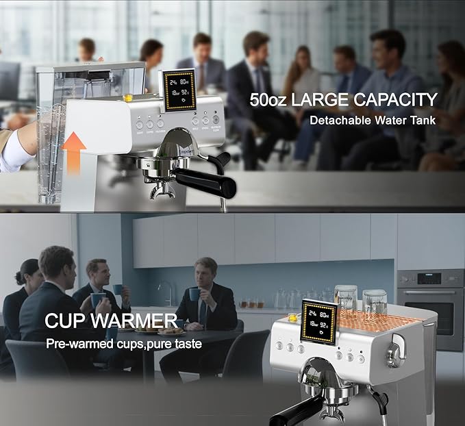 - ⚡️Convenience is King: This coffee maker espresso features a 1500ml (50oz) removable water tank for easy refills, plus a removable drip tray with float indicator to prevent overflows. Top cup warmer ensures your coffee stays hot from first sip to last