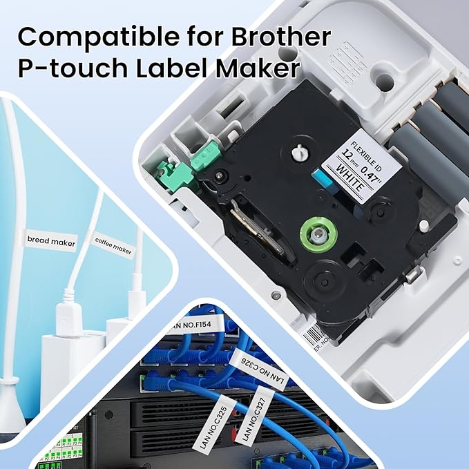 TZe-FX231 Flexible ID Laminated Cable Wire Labels 12mm 0.47 Laminated White Compatible with Brother P-Touch for Wire Wrapping and Flagging, 26.2FT/8M for PT-D210/D400/D600/H110 Label Makers