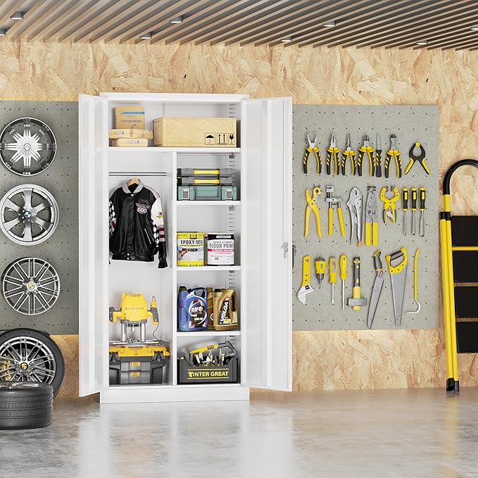 - 【Adjustable Large Space】: Locking metal locker cabinet is equipped with 4 adjustable shelves and a hanging rod, not only can be a storage cabinet, but also a clothes closet. The larger size (72” H x 32” W x16” D) is enough for your daily needs, and suitable for your office, bedroom, bathroom, basement, warehouse etc.