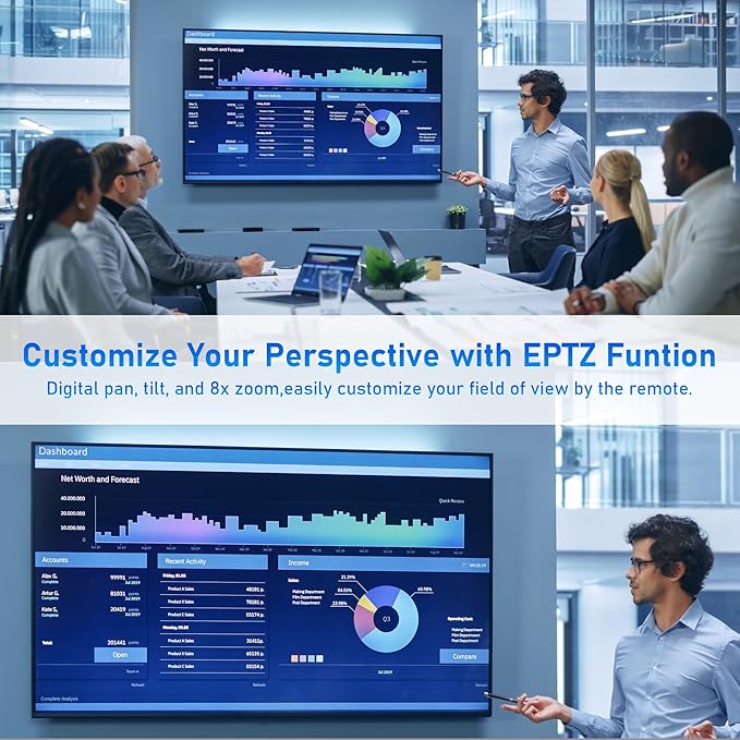 - With Remote Control & ePTZ Function ---- The V21 computer camera supports remote control, allowing you to customize your viewing field with its digital pan, tilt and 8X zoom. The remote also features one-touch controls to restore the view, freeze video, mute, adjust manual focus, and control the volume. With 120° wide angle, this usb camera for computer can provide a wider view.