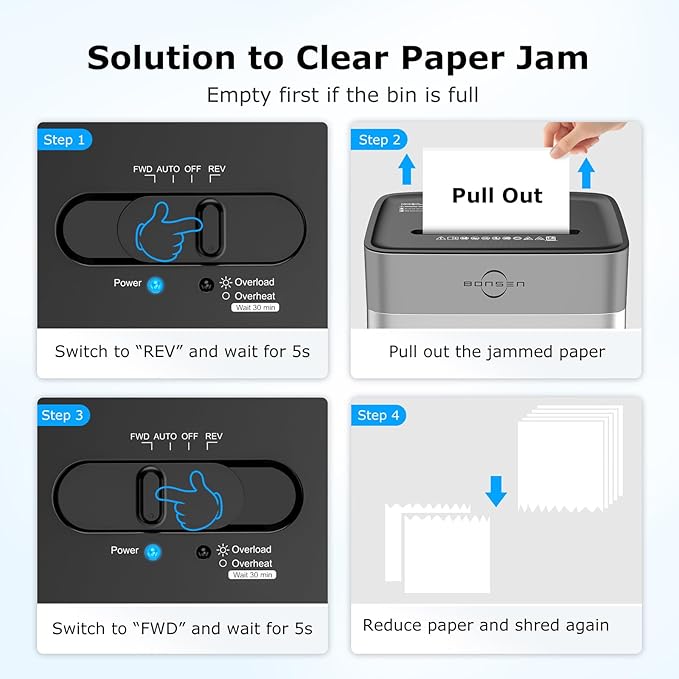 - Smart Jam-Proof System: With Auto Start/Stop/Reverse sensors and real-time indicator lights for overheating and overload, this heavy duty shredder for home office delivers hassle-free shredding performance, reduces downtime and extends shredder life, making it a reliable partner for high-volume shredding.