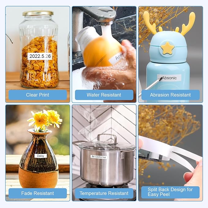 - Features: 12mm black on white label tape compatible with Brother P Touch label tape tz tze 12mm 0.47 inch white tape is waterproof, abrasion resistant, fade resistant, and temperature resistant. The split-back design for easy peel