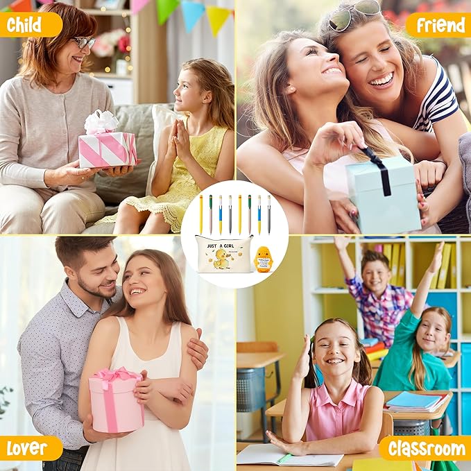- Cheerful Little Yellow Duck Design: This cute yellow duck-themed stationery set includes 8 gel pens, 1 hand-knitted duck, and 1 zippered duck bag. The cute, happy duck design brings a sense of sunshine and joy to your day. Great for school, office, or home, this multifunctional set promotes stress relief and positive vibes—great for duck lovers of all ages!