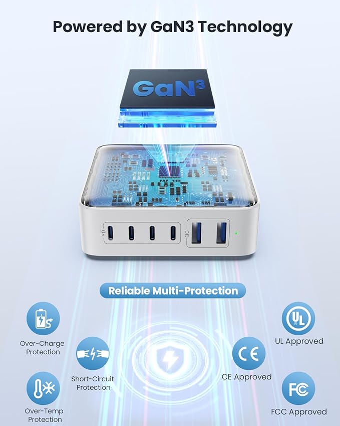 USB C Charger Block 200W[2025 Upgraded] GaN III 6 Port Fast Charging Station Hub,PD 65W USB C Laptop Charger Compatible with MacBook Pro/Air,iPad,iPhone 16/15,Galaxy S23/S24 Steam Deck Dell XPS etc