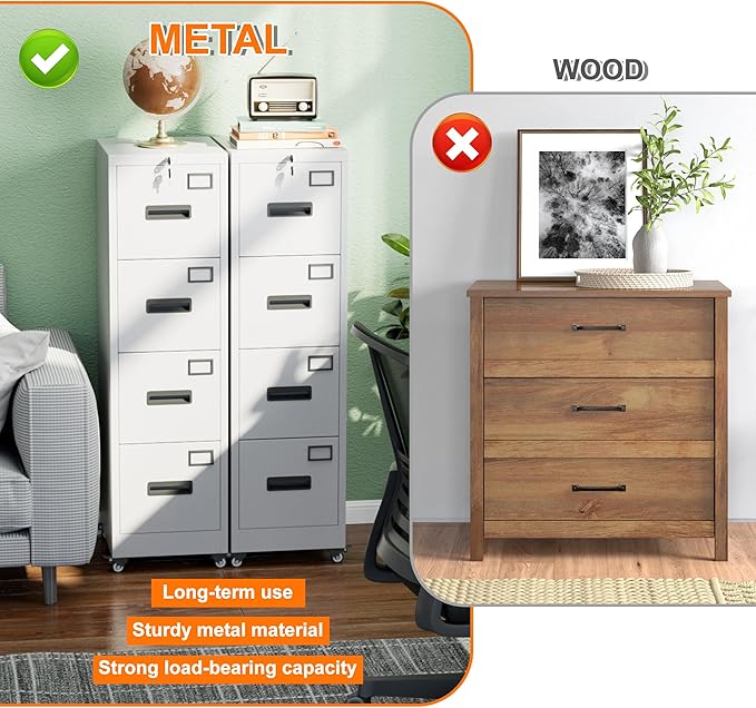 - 【Moveable on 4 wheels】Metal File Cabinet with wheels has 4 small lockable wheels, you can move them around as needed and the casters and wheels work great on all the different surfaces, besides the wheels can be locked and you can fix the cabinet where you want to place