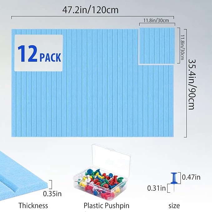 - Enhanced Package:12 pieces of 11.8"x11.8" Large Cork Board for Walls,A box of push pins, pinseasy to customize to any size you need. Very suitable for creating unique layouts that traditional hardwood boards cannot match.