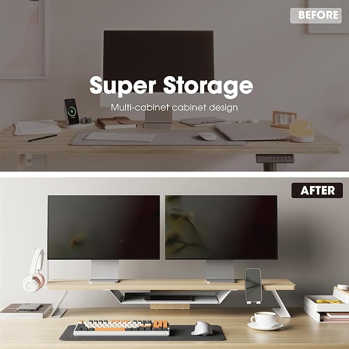 - 【All-in-One Workstation】Fenge desk shelf innovatively combines dual monitor stand with phone stand and headphone holder, meets the needs of multi-device office work. The second shelf (16.5”L×2.1”H ) stores office accessories, maximizes space for a clean, efficient workstation.