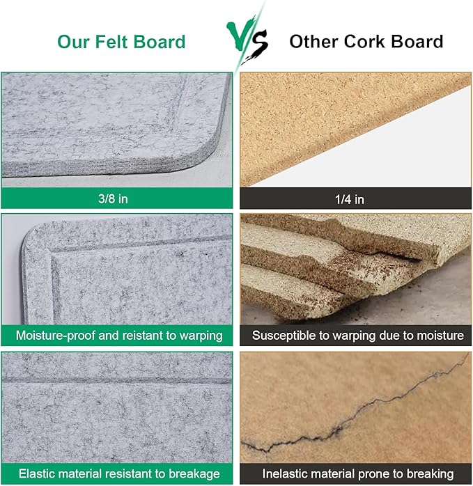 - Cork Board Alternative: Our felt board boasts smooth surface. The material is strong, easy to maintain, durable, and won't deform in humid air. No nails are required to install, and the included Velcro are removable and safe for your walls. A good choice for home offices, classrooms, and commercial places.