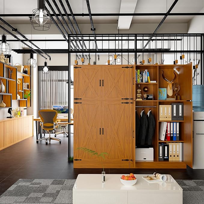 - 【Elegant Wardrobe Closet】Our tall wardrobe closet features a farmhouse style with classic barn doors, black metal handles and accents, perfectly blending a modern country aesthetic with the warmth of a vintage farmhouse, complementing a variety of decor styles in your living space.