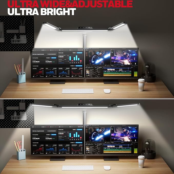 - FLEXIBLE ROTATABLE FOR MULTI-ANGLE: The flexibility 800 lumen clamp desk lamp features a horizontal pivot axis and two vertical movable pivot axes, allow you to adjust the lamp neck and lamp head in multiple angle. Whether you require focused illumination for detailed tasks or wider light diffusion for detail task, this computer desk lamp provides the adaptability needed to meet your specific requirements.