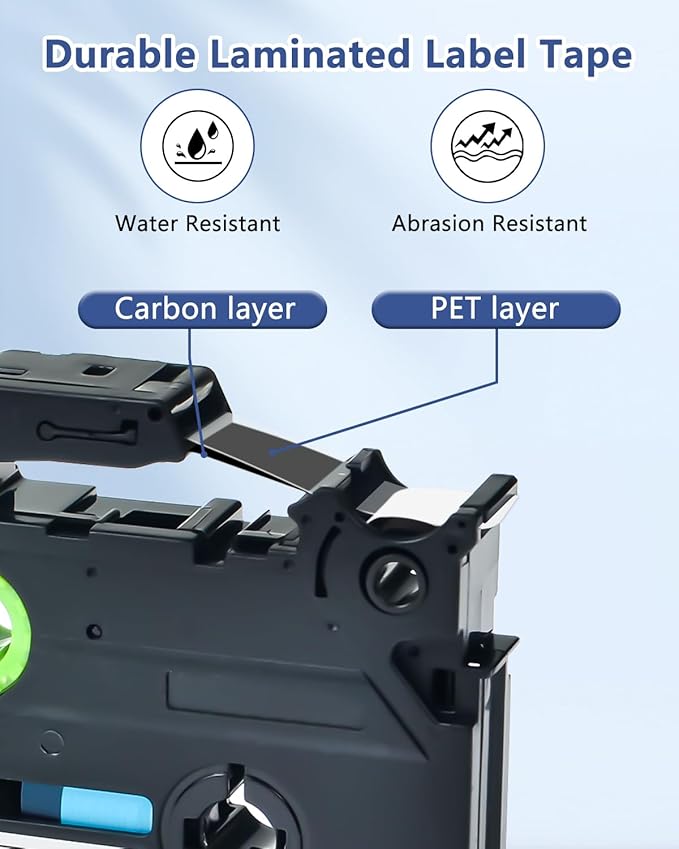 - Size & Color & Features: Width of Tape: 18mm 0.7 inch (3/4 inch); Length of Tape: 8m (26.2 feet); Color of Tape: Black Text Print on White Tape. Feature of Tape: Laminated, Strong Adhensive, Chemical and Water Resistant, Abrasion Resistant, Temperature Resistant, Fade Resistant.