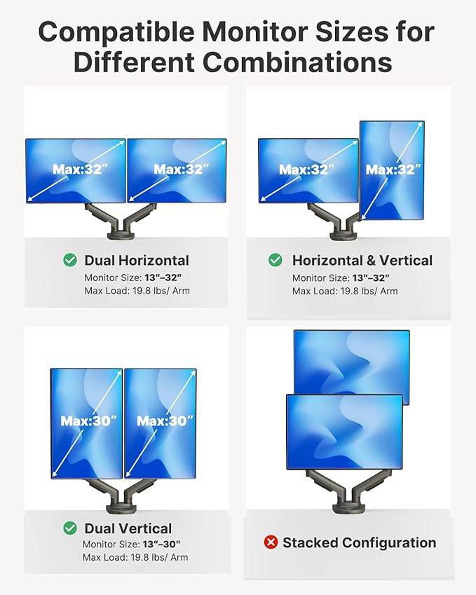 HUANUO Dual Monitor Stand - Full Adjustable Monitor Desk Mount Swivel Vesa Bracket with C Clamp, Grommet Mounting Base for 13 to 32 Inch Computer Screens - Each Arm Holds 4.4 to 19.8lbs -Grey