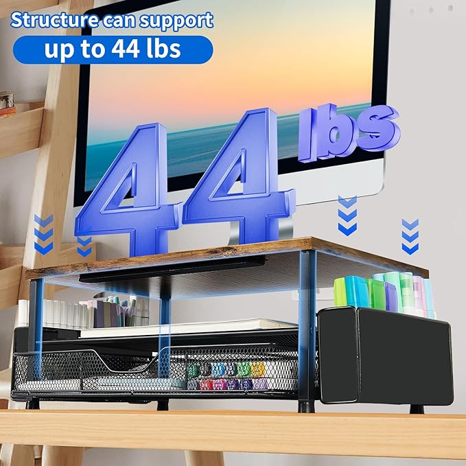 - Space-saving Solution: This dual-tier desk shelf computer stand with a drawer and 2 pen holders provides ample storage for your office supplies and office desk accessories. Enjoy a tidy workspace that enhances your daily mood