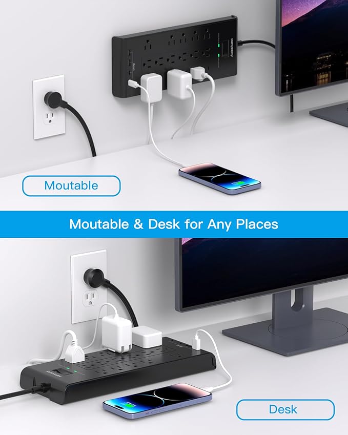 - 【Surge Protector Power Strip with USB C Ports】: 4 USB ports total 3.1 A, each USB A port features 2.4A Max output. USB C charging port features 3A MAX. Built- with smart technology, detecting charging devices and deliver optimal charging speed automatically, compatible with most USB devices.