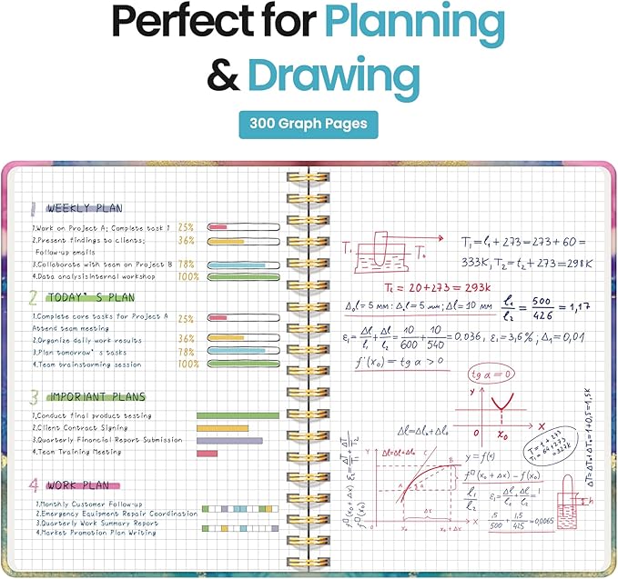 Spiral Graph Paper Notebook Journal for Work, 300 Pages, Thick B5 (7.1"x10") Grid Journals for Women & Writing, Hardcover Notebook for Note Taking, Perfect for Work School Note Taking Business, Color Splash