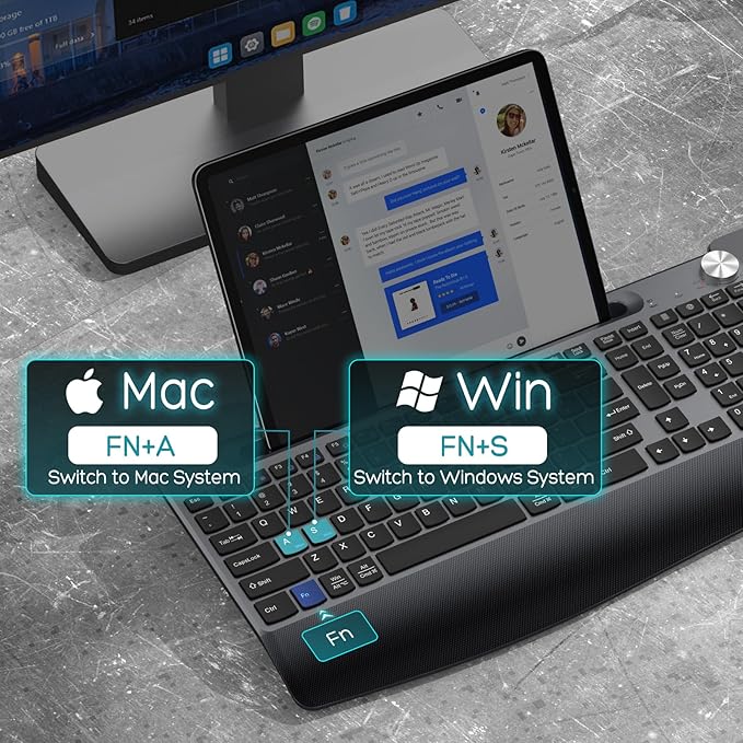 - 【Full-Size Keyboard With Phone Holder】The full-size wireless keyboard is designed with a phone and tablet holder. Provides you with additional space to place your phone, tablet, or other gadgets,never miss anything important messages again.You can work by using a laptop when placing a phone or tablet, or watching videos while working.(Note: Keyboard only hold the devices,not work with them.)